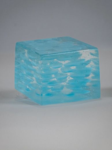 Blue petals floating in a sea of clear water. At only 2 inches in diameter, this pocket sculpture transmits you to a tranquil place.