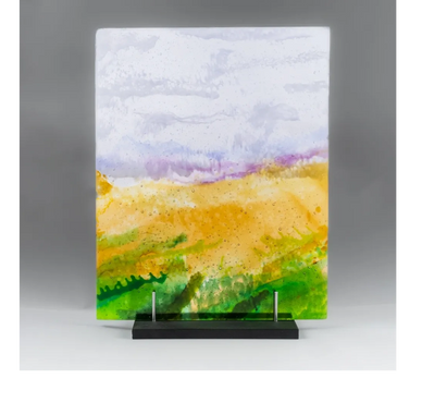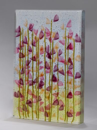 Layers of transparent glass heated on an inclined kiln shelf creates wonderful flowing patterns. The glass is then cut, reassembled, and refired to form beautiful abstract art. The glass tells me what it wants to be. Size 11 x 14 inches