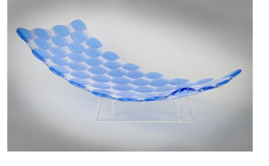 Blue is one of my favorite colors. Each piece is hand-built from many different types of glass and then full fused. Next a special gig is set-up in the kiln to slump (bend) the glass as it heats up. Each side is done in a separate firing. The glass is observed to determine the right time to stop the slumping process.