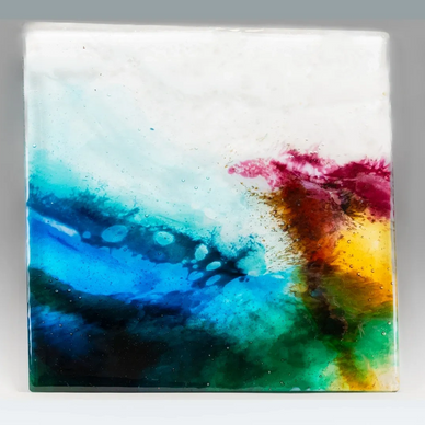 Layers of transparent glass heated on an inclined kiln shelf creates wonderful flowing patterns. The glass is then cut, reassembled, and refired to form beautiful abstract art. The glass tells me what it wants to be. Size 10 1/2 x 10 1/2 inches