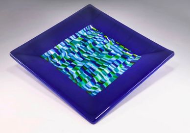 Small pieces of glass are cut and fitted to create a watery color palette. The plate is fused again to create a lovely blue border.