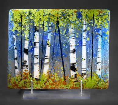 This plate is constructed using fine glass powder and on-edge accent cut outs. It is both decorative and functional.