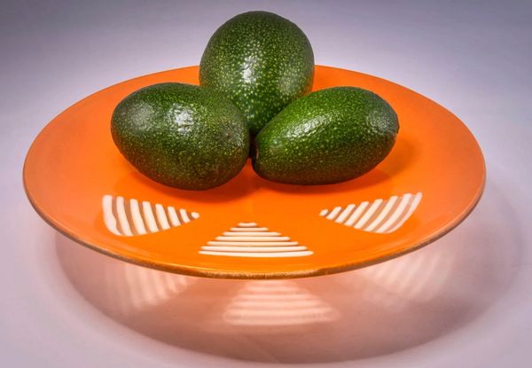 The glass is manipulated using heat to create an organized bubble pattern. It’s then fired two more times to develop and shape the plate. It is decorative and functional.